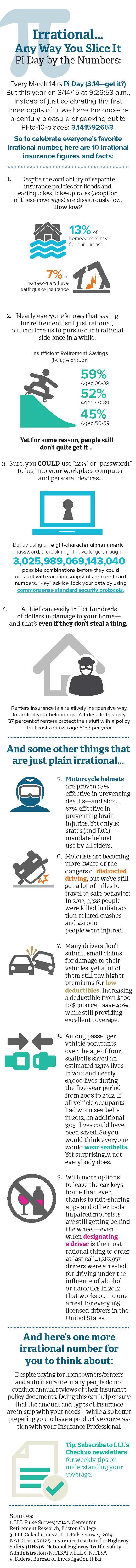 Not to be outdone, the I.I.I. has created a fun and informative infographic illustrating “10 Irrational Numbers” about insurance to observe this auspicious occasion.