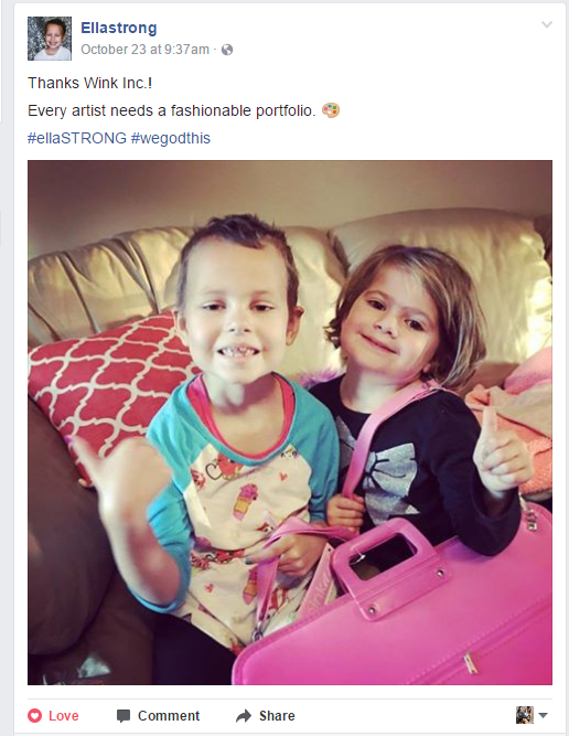 Below, in our first entry from back in January 2016, we tell a story about Ella, are special friend diagnosed with a cancerous brain tumor in December 2015 and fighting ever since. We heard that Ella is a budding artist so we sent her a fabulous pink portfolio for her to store all of her masterpieces in. She has had a tough road with physical therapy on top of her surgeries, multiple treatments, and endless doctor visits. #EllaStrong!! We believe in her! #WeGodThis