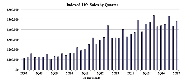 Indexed life second quarter sales were $485.0 million; a figure that was up more than 11.2% when compared with the prior quarter, and up nearly 10.0% as compared to the same period last year. “Indexed life sales are on track to set another sales record in 2017” exclaimed Sheryl J. Moore, President and CEO of both Moore Market Intelligence and Wink, Inc. She added, “The most recent trends in product development are absolutely translating to increased sales of these innovative products.”