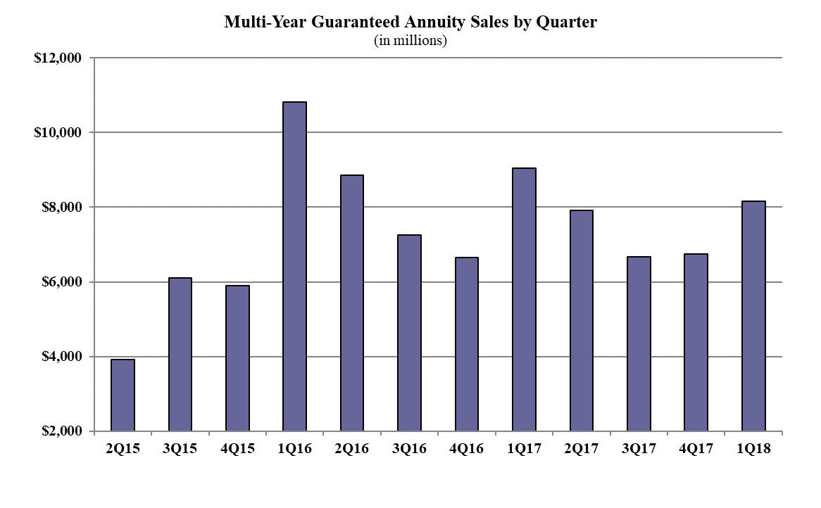Multi-year guaranteed annuity (MYGA) sales in the first quarter were $8.1 billion; up 20.9% when compared to the previous quarter, and down 9.8% when compared to the same period last year. MYGAs have a fixed rate that is guaranteed for more than one year.
