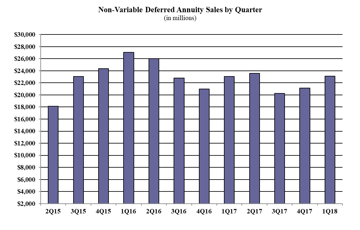 Sixty indexed annuity providers, 64 fixed annuity providers, 74 MYGA providers, and six structured annuity companies participated in the 83rd edition of Wink’s Sales & Market Report for 1st Quarter, 2018. Total first quarter non-variable deferred annuity sales were over $23.1 billion; up 9.4% when compared to the previous quarter and up 0.2% when compared to the same period last year. Non-variable deferred annuities include the indexed annuity, traditional fixed annuity, and MYGA product lines