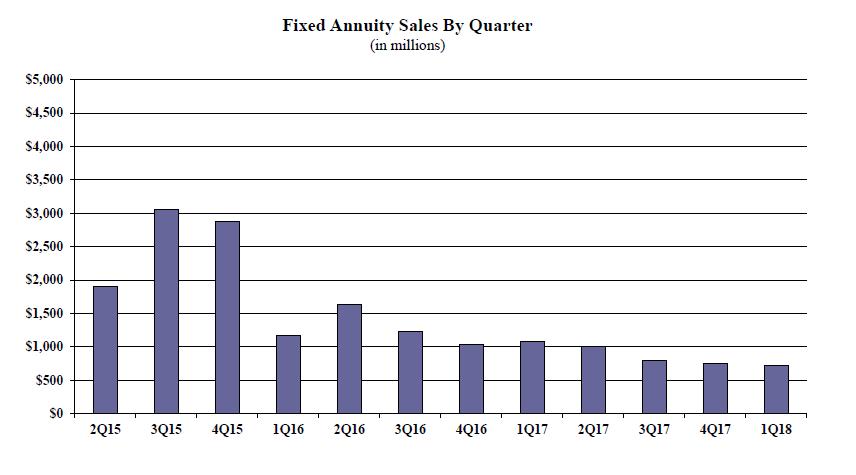 Traditional fixed annuity sales in the first quarter were $729.7 million; down 3.3% when compared to the previous quarter, and down 32.1% when compared with the same period last year. Traditional fixed annuities have a fixed rate that is guaranteed for one year only.