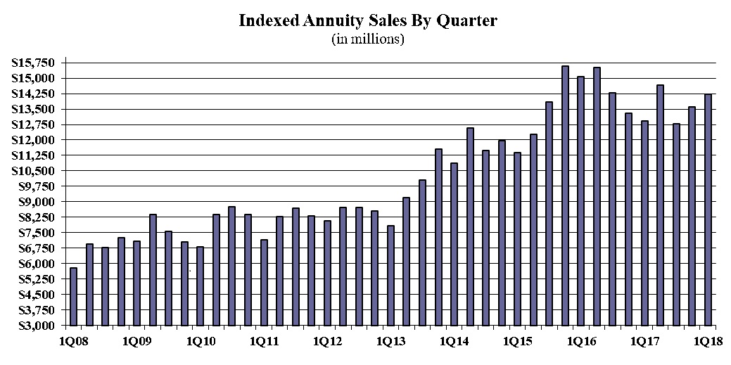 Indexed annuity sales for the first quarter were $14.2 billion; up 4.4% when compared to the previous quarter, and up 10.0% when compared with the same period last year. Indexed annuities have a floor of no less than zero percent and limited excess interest that is determined by the performance of an external index, such as Standard and Poor’s 500®.