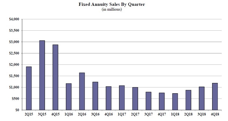 Traditional fixed annuity sales in the fourth quarter were $1.1 billion; up 15.9% when compared to the previous quarter, and up more than 56.8% when compared with the same period last year. Total traditional fixed annuity sales for 2018 were $3.8 billion, an increase of 5.1% over the previous year. Traditional fixed annuities have a fixed rate that is guaranteed for one year only.