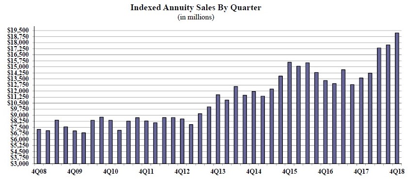 Indexed annuity sales for the fourth quarter were $19.2 billion; up more than 8.4% when compared to the previous quarter, and up 40.9% when compared with the same period last year. Total indexed annuity sales for 2018 were $68.4 billion, an increase of over 26.8% from the previous year. Indexed annuities have a floor of no less than zero percent and limited excess interest that is determined by the performance of an external index, such as Standard and Poor’s 500®.