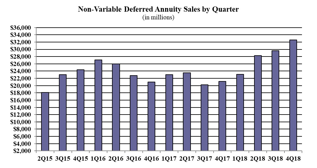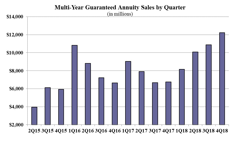 Multi-year guaranteed annuity (MYGA) sales in the fourth quarter were $12.2 billion; up over 12.3% when compared to the previous quarter, and up more than 81.3 % when compared to the same period last year. Total MYGA sales for 2018 were $41.3 billion, a 36.1% increase over the previous year. MYGAs have a fixed rate that is guaranteed for more than one year.