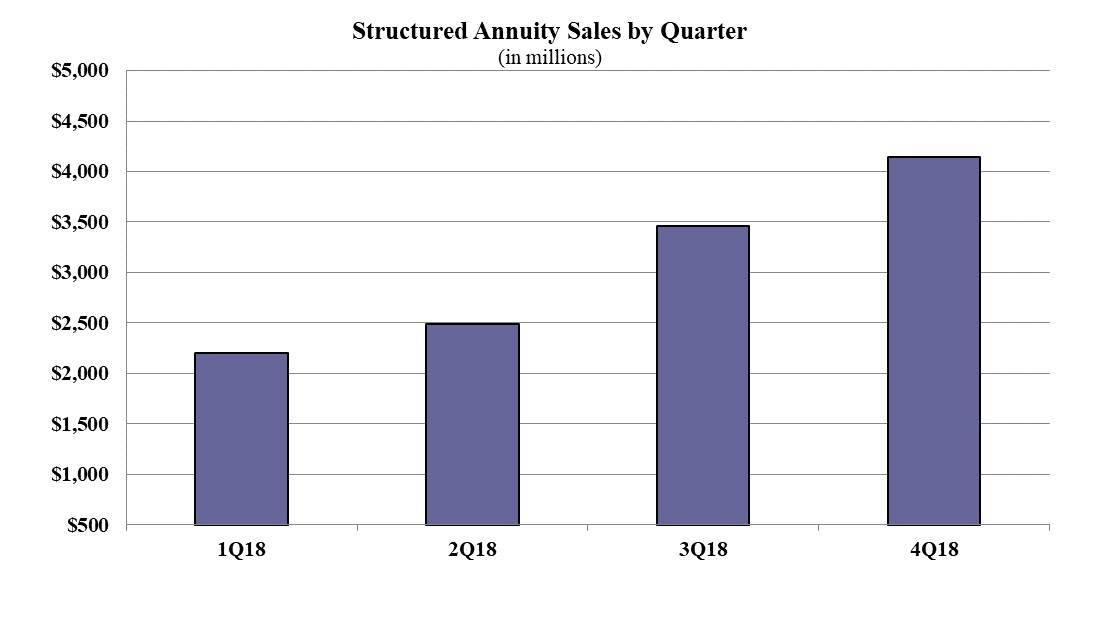 Structured annuity sales in the fourth quarter were $4.1 billion; up more than 19.4% as compared to the previous quarter. Total structured annuity sales for 2018 were $12.2 billion; this is the first year that Wink has reported on structured annuity sales. Structured annuities have a limited negative floor and limited excess interest that is determined by the performance of an external index or subaccounts.