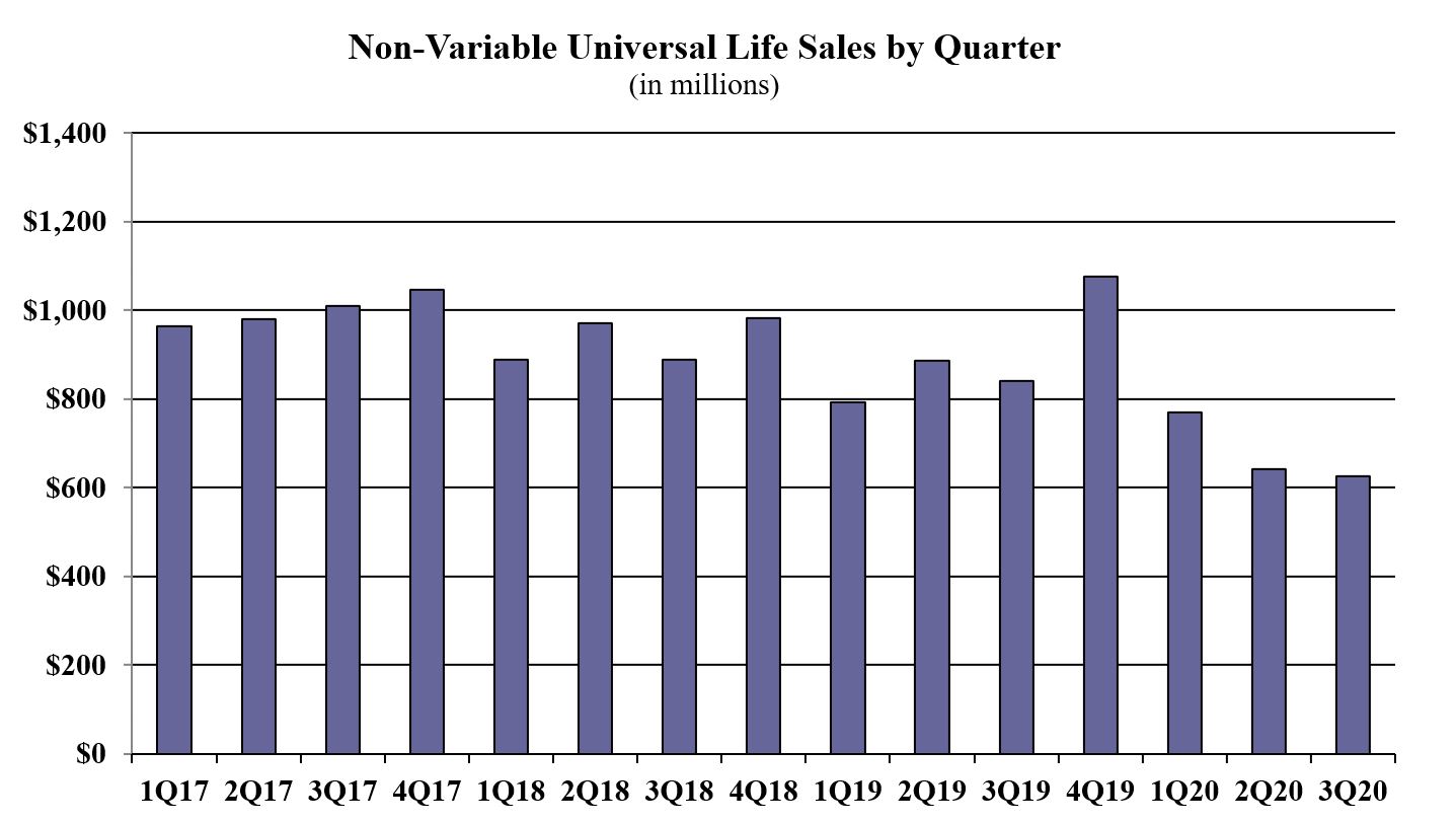 Non-variable universal life sales for the third quarter were $624.9 million; down 5.2% when compared to the previous quarter and down 25.7% as compared to the same period last year. Non-variable universal life (UL) sales include both indexed UL and fixed UL product sales.
