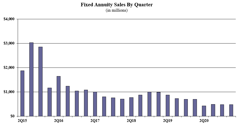 Traditional fixed annuity sales in the first quarter were $477.0 million; sales were up 0.6% when compared to the previous quarter, and down 31.0% when compared with the same period last year. Traditional fixed annuities have a fixed rate that is guaranteed for one year only.