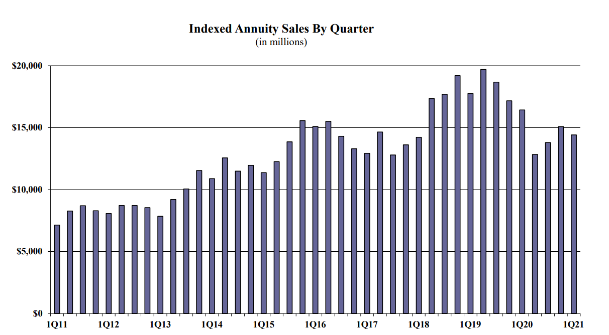 Indexed annuity sales for the first quarter were $14.4 billion; down 4.4% when compared to the previous quarter, and down 12.2% when compared with the same period last year. Indexed annuities have a floor of no less than zero percent and limited excess interest that is determined by the performance of an external index, such as Standard and Poor’s 500®.