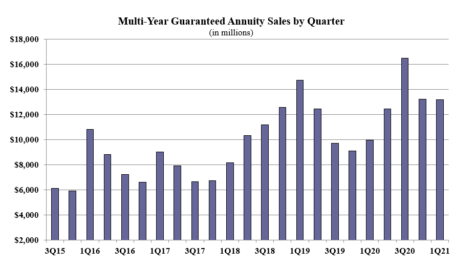 Multi-year guaranteed annuity (MYGA) sales in the first quarter were $13.2 billion; down 0.1% when compared to the previous quarter, and up 32.4% when compared to the same period last year. MYGAs have a fixed rate that is guaranteed for more than one year.