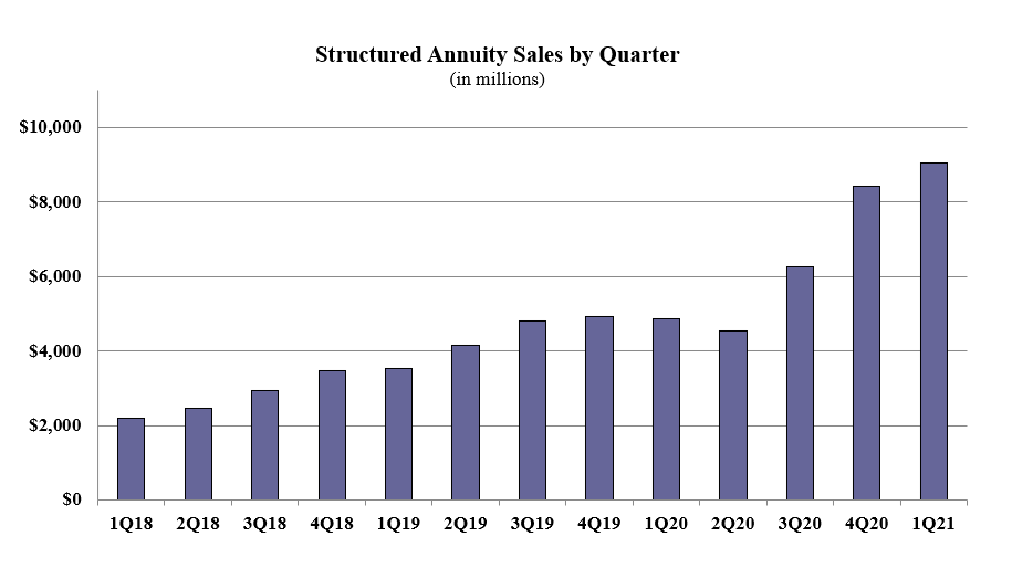 Structured annuity sales in the first quarter were $9.0 billion; up 7.5% as compared to the previous quarter, and up 85.7% as compared to the previous year. Structured annuities have a limited negative floor and limited excess interest that is determined by the performance of an external index or subaccounts.