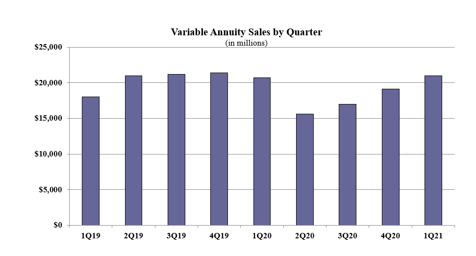 Variable annuity sales in the first quarter were $21.0 billion, an increase of 9.9% as compared to the previous quarter and an increase of 1.3% as compared to the same period last year. Variable annuities have no floor, and potential for gains/losses that are determined by the performance of the subaccounts that may be invested in an external index, stocks, bonds, commodities, or other investments.