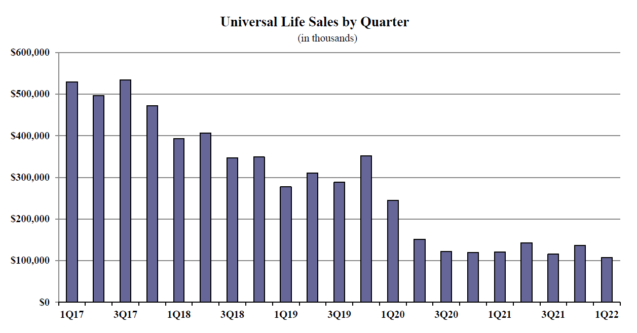 Non-variable universal life sales for the first quarter were $737.4 million; down 13.7% when compared to the previous quarter and up more than 12.8% as compared to the same period last year. Non-variable universal life (UL) sales include both indexed UL and fixed UL product sales.