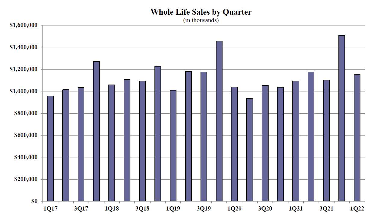 Whole life first quarter sales were $1.1 billion, down more than 23.6% when compared with the previous quarter, and up more than 5.2% as compared to the same period last year. Items of interest in the whole life market included the top pricing objective of Final Expense capturing 55.1% of sales. The average premium per whole life policy for the quarter was $3,177; a decline of nearly 14.0% from the prior quarter.