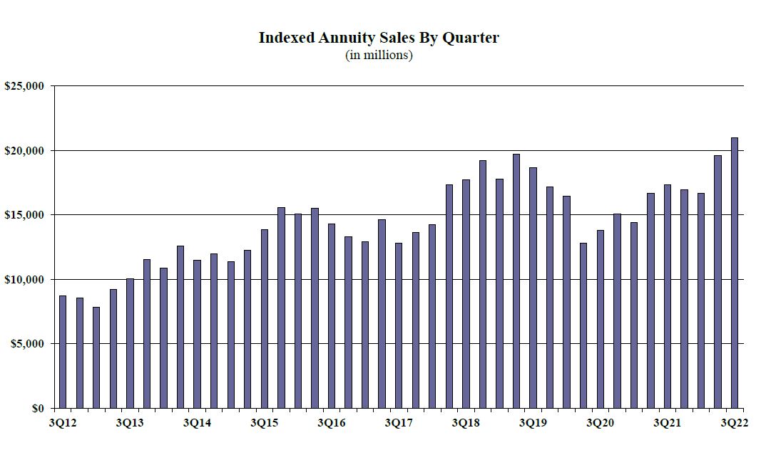 Indexed annuity sales for the third quarter were $20.9 billion; up more than 6.9% when compared to the previous quarter, and up more than 20.9% when compared with the same period last year. Indexed annuities have a floor of no less than zero percent and limited excess interest that is determined by the performance of an external index, such as Standard and Poor’s 500®.