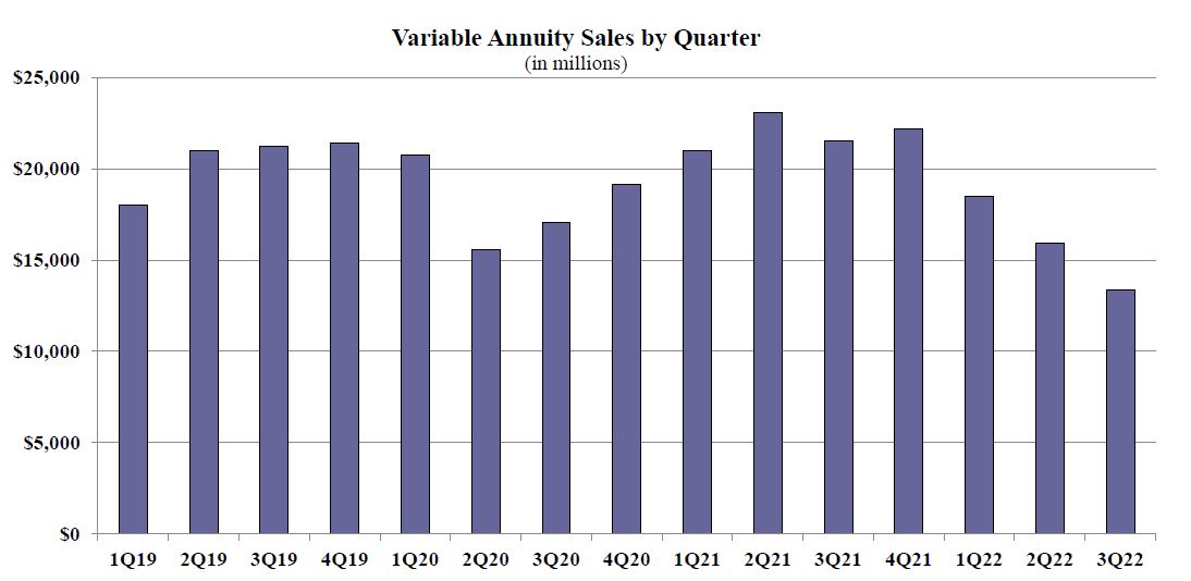 Variable annuity sales in the third quarter were $13.3 billion, down more than 15.9% as compared to the previous quarter and down more than 37.8% as compared to the same period last year. Variable annuities have no floor, and the potential for gains/losses is determined by the performance of the subaccounts that may be invested in an external index, stocks, bonds, commodities, or other investments.